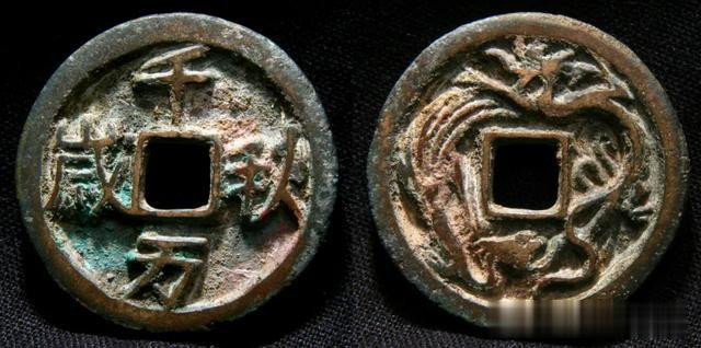 4、左字释为汉字“万”,与汉字相同,属表意。此钱“万”字第二横出头的写法,在五代、辽的千秋万岁花钱中经常能见到。